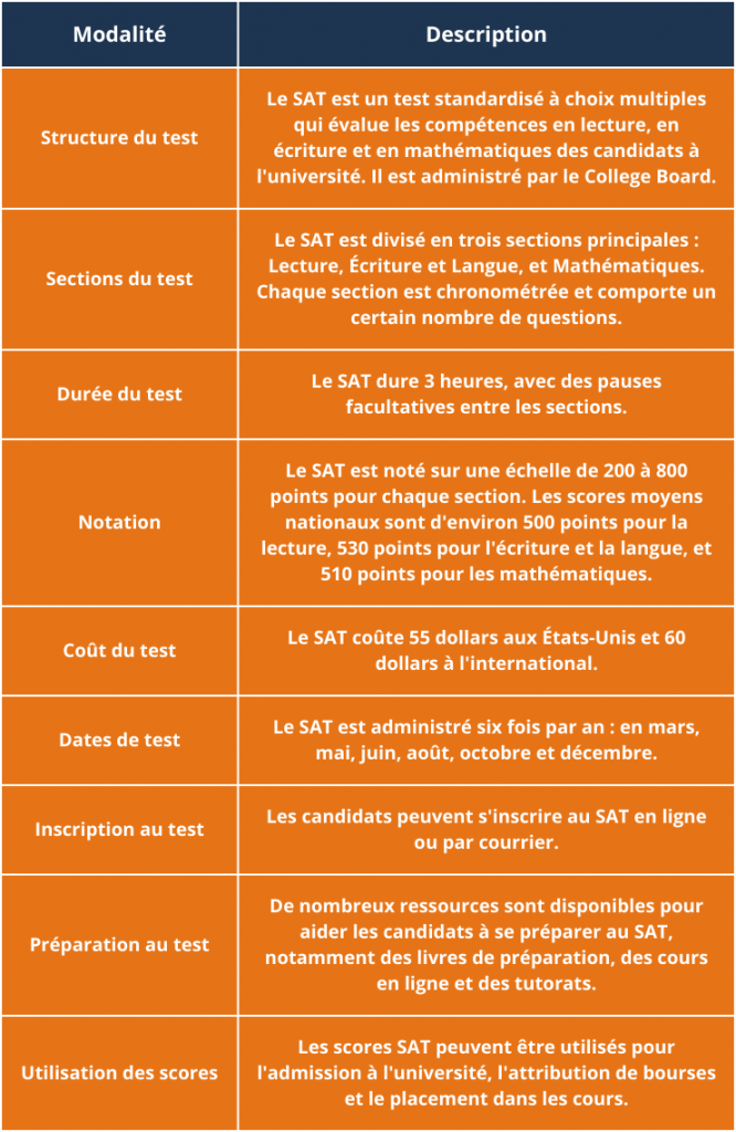 Le SAT est un passeport privilégié pour les écoles de gestion de renom dans le monde entier. Les institutions les plus prestigieuses exigent souvent un score élevé au SAT comme critère d’admission. C’est votre occasion de faire impression et de garantir votre place parmi l’élite éducative.